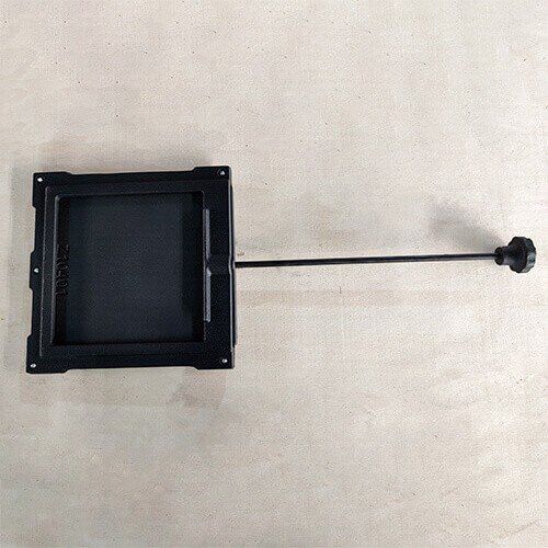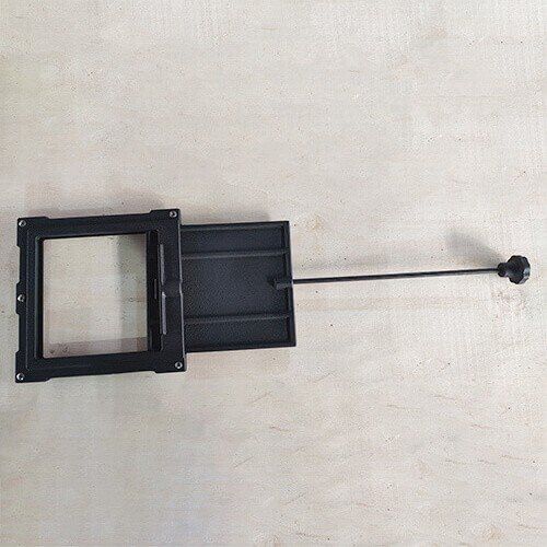 The cast iron frame is embedded into masonry, allowing the sliding plate to move smoothly within the guide grooves.