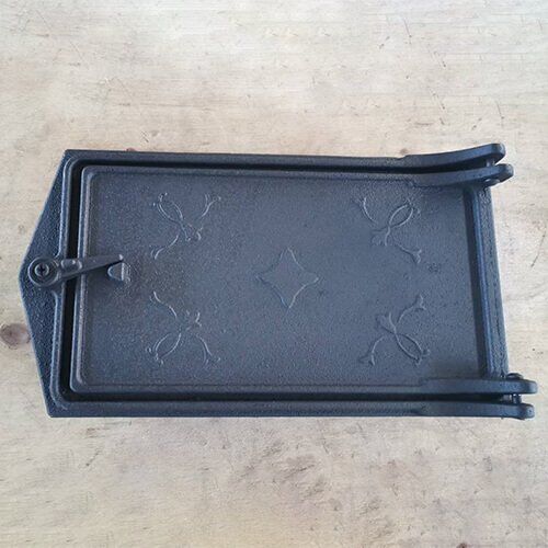 The P107 ash door is a high-quality cast iron component designed for wood stoves and masonry heaters. Crafted from durable grey cast iron, it ensures long-lasting performance and precise fit. Its black finish adds a professional appearance while providing excellent heat resistance.